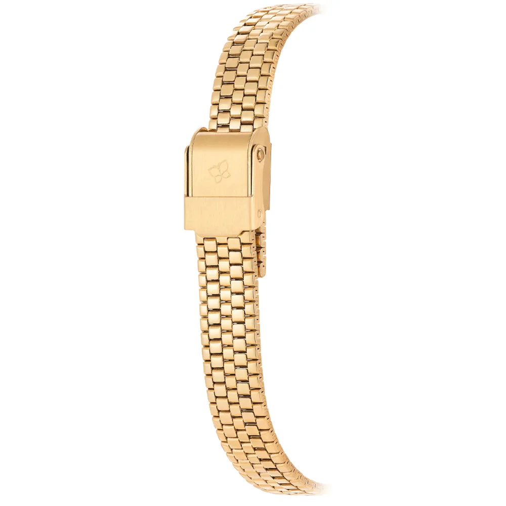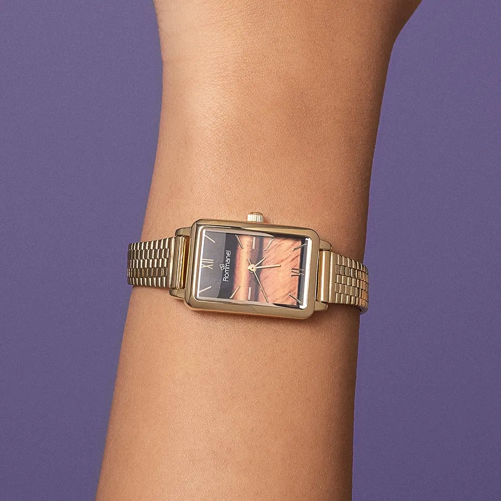 Relógio analógico social na cor dourado, caixa retangular de metal, mostrador âmbar com números romanos e ponteiros dourados, vidro de material mineral e pulseira de metal dourada com fecho slide de pressão. Resistente a água em até 30 m. Não acompanha a joia da foto (meramente ilustrativa).